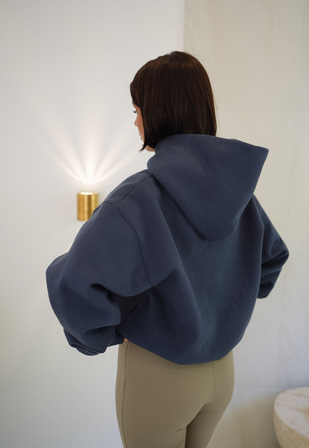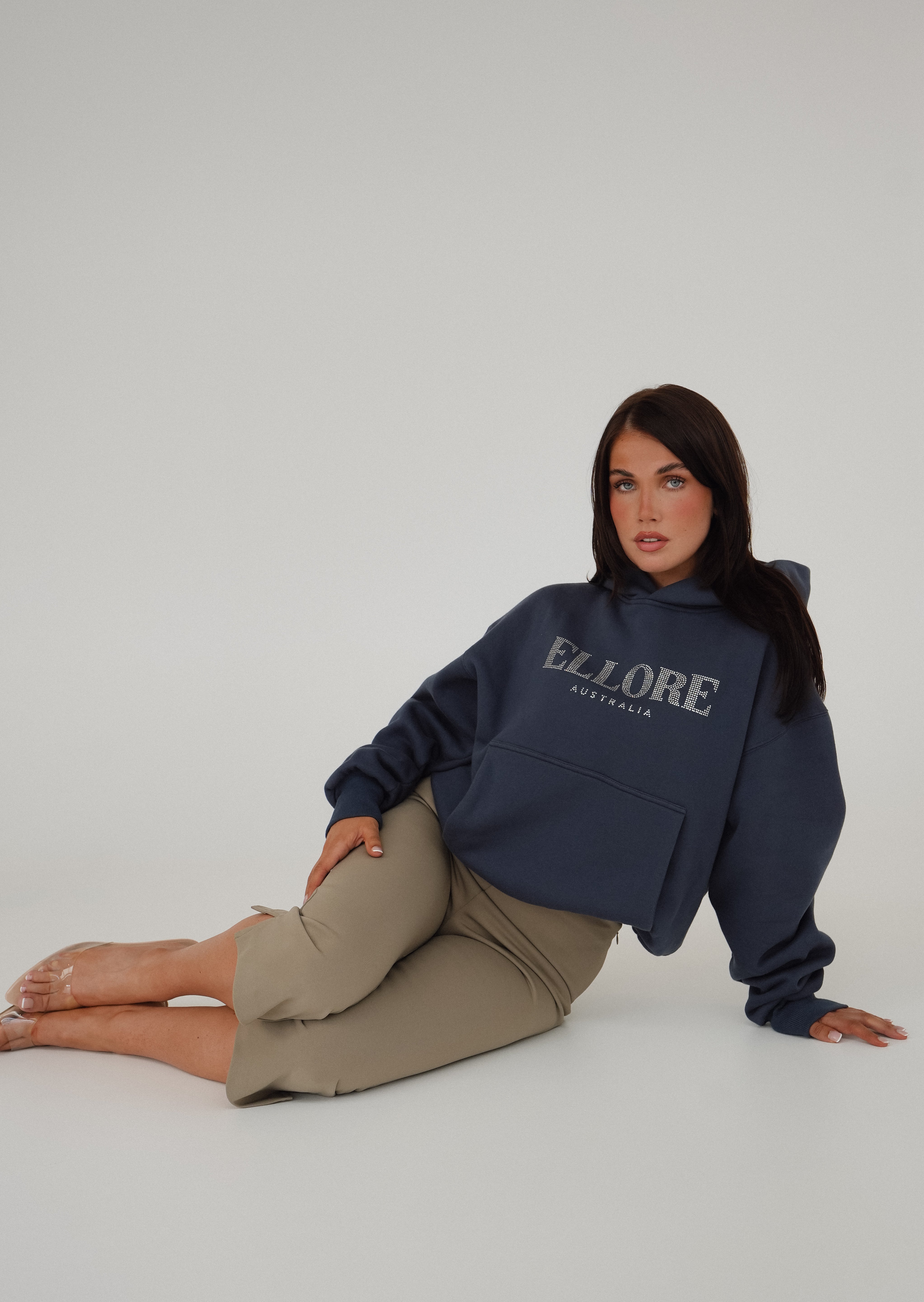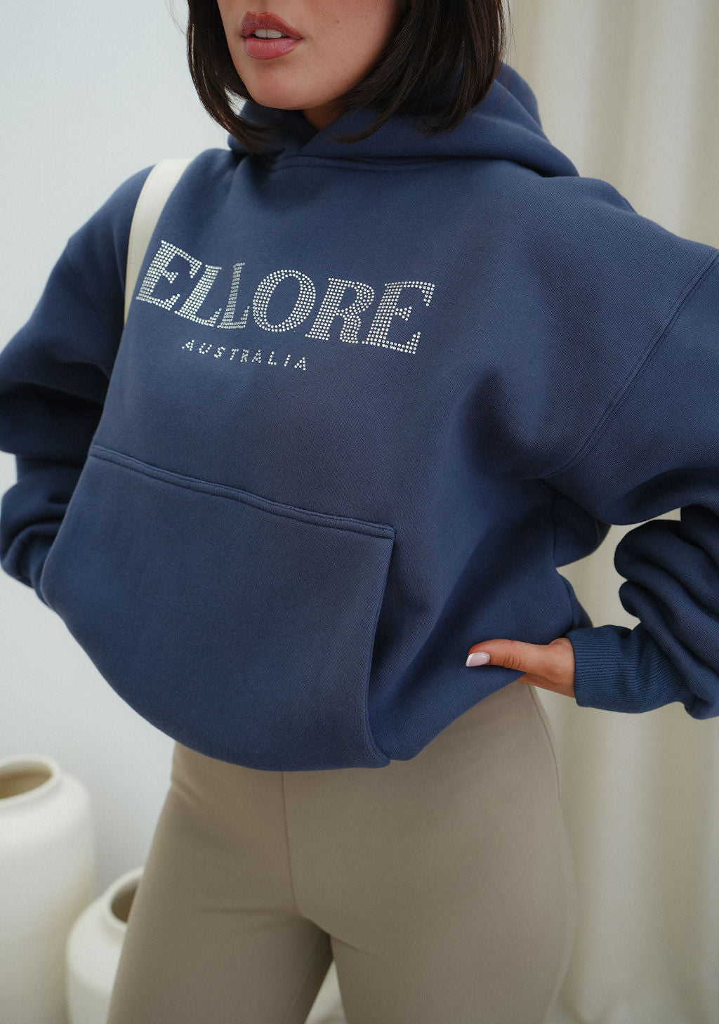 This hoodie has been meticulously crafted with a range of thoughtful upgrades to make it truly exceptional and exclusive for those lucky enough to own it. Key enhancements include a larger & seamless hood, an even boxier fit, a spacious kangaroo pouch, stronger ribbing, an adjustable waistband, and of course our signature Ellore but embellished. This hoodie features a cropped silhouette with a more cinched waistband for a slightly different fit than our OG hoodies.